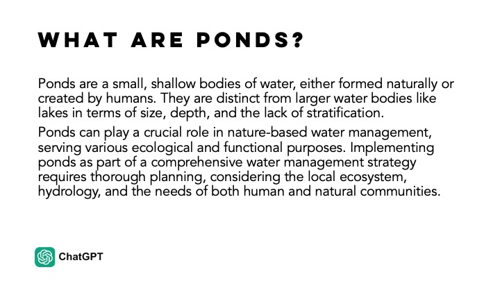 Ponds are a small, shallow bodies of water, either formed naturally or created by humans. They are distinct from larger water bodies like lakes in terms of size, depth, and the lack of stratification. Ponds can be utilised for nature-based water management for several reasons, such as water storage and retention, water quality management and biodiversity enhancement.
